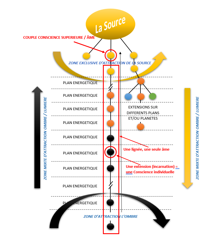 Celle-ci a pour point de départ l’association d’une âme et d’une conscience supérieure. Elles se situent dans la Source ou à proximité, dans ce que j’appelle la « zone exclusive d’attraction ». Ce couple âme et conscience supérieure désire s’enrichir d’expérience afin de continuer son chemin d’élévation. Ce souhait va se concrétiser par la création d’une lignée d’extension. Il n’y a qu’une seule âme pour toute la lignée mais la conscience supérieure va générer autant d’extensions qu’il y aura d’incarnations. J’ai nommé ces extensions « conscience individuelle ». L’âme, comme la conscience supérieure, est omnisciente. Elle est reliée de manière permanente à la Source, ce qui n’est pas le cas de la conscience individuelle qui doit apprendre par l’expérience. Il n’y a pas de fracture entre elle et la Source, mais une essence différente qui ne permet pas le même lien. Ce couple âme/conscience est intimement relié, ce sont deux natures différentes mais en parfaite osmose.
